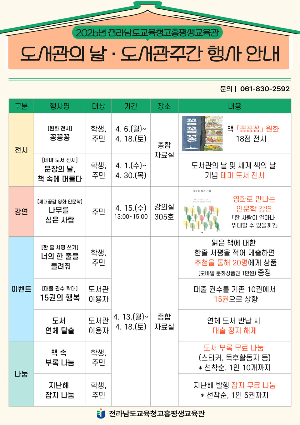 주요 행사로는 ▲「꽁꽁꽁」 원화 전시 ▲문장의 날, 책 속에 머물다 테마 도서 전시 ▲나무를 심은 사람 영화인문학 강연 ▲너의 한 줄을 들려줘 한 줄 서평 쓰기 ▲15권의 행복 대출 권수 확대 ▲도서 연체 탈출 이벤트 등을 운영해 이용자 참여를 확대하고 도서관 이용 활성화를 도모할 계획이다.