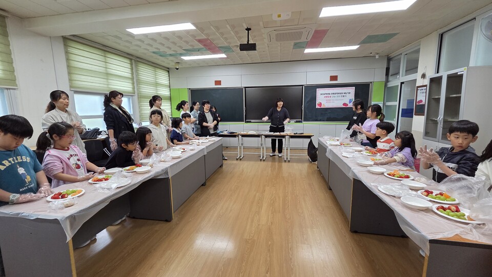 활동에는 전교생과 다수의 학부모가 참여해 과일모찌 만들기 과정을 배우고 직접 실습에 나섰다.