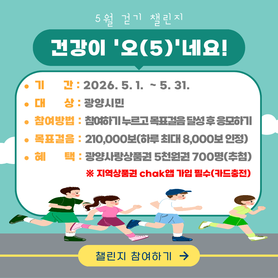 이번 챌린지는 하루 최대 8천 걸음까지 인정되며, 기간 내 누적 21만 보를 달성한 참여자는 광양사랑상품권 5천 원권 응모 자격이 주어진다.