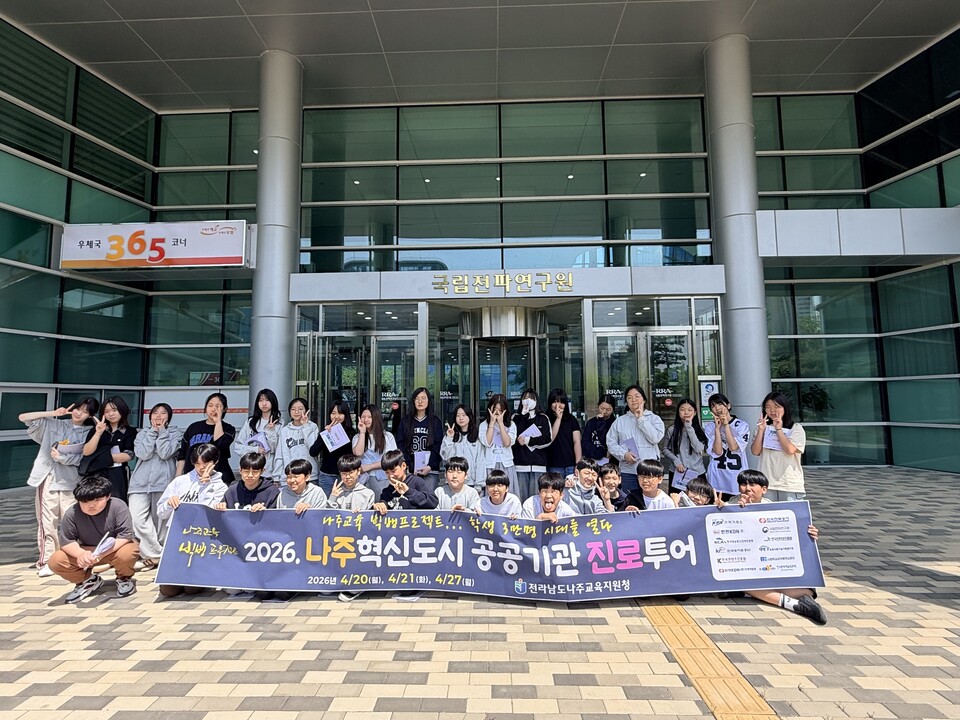 빛가람중학교(교장 반옥기)는 2026년 4월 27일 빛가람중학교 1학년 196명을 대상으로 「나주혁신도시 공공기관 진로투어」를 운영하였다. 「진로투어」는 2022년 시작해 2026학년도에는 나주혁신도시 공공기관 16개 중 9개 기관이 협력하여 교육과정을 개발하여 학교, 선생님, 학생의 높은 만족도를 보이고 있는 프로그램 중 하나이다. 2026년「나주혁신도시 공공기관 진로투어」는 나주혁신도시 공공기관 16기관 중 참여기관인 한국전력공사, 한전 KPS(주) 인재개발원, 국립전파연구원, 한전KDN(주), 한국인터넷진흥원, 사립학교교직원연금공단, 한국문예술위원회, 한국콘텐츠진흥원 등이 적극적으로 협력하여 만들어진 프로그램으로 나주교육 협치의 성과라 할 수 있다. ‘나주형 진로․진학 프로젝트’중 하나인 「진로투어」는 초·중학생의 진로 탐색 지원을 위한 지역사회 상생협력 진로교육이다.