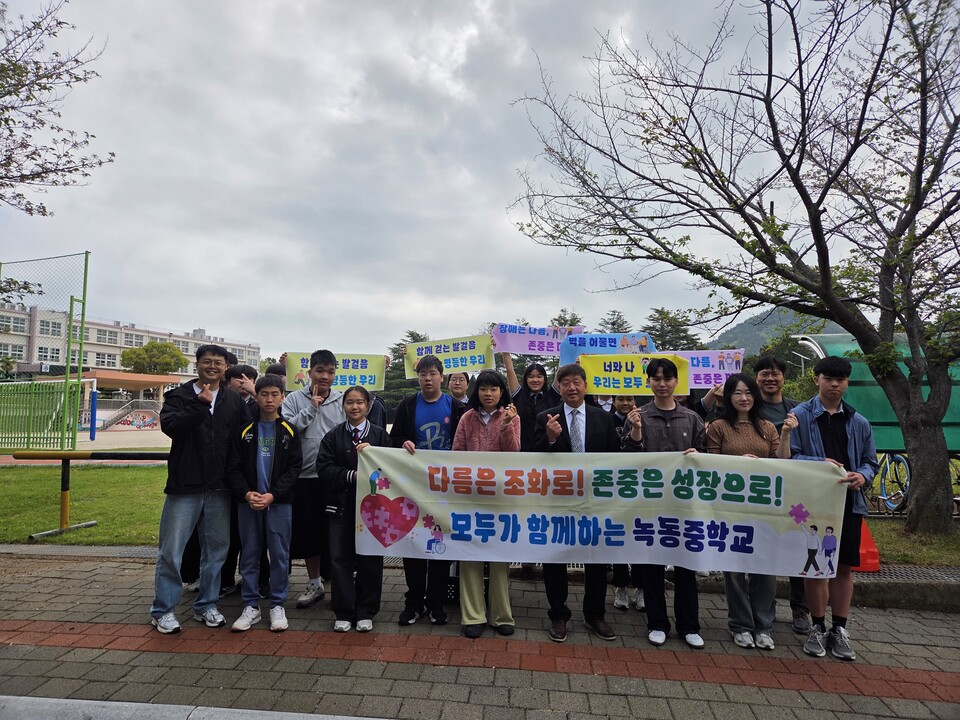 녹동중학교(교장 김수기)는 4월 20일, 제46회 장애인의 날을 맞아 학생 자치회와 특수학급 학생들이 함께하는 ‘장애 인식 개선 등교맞이 캠페인’을 실시했다.