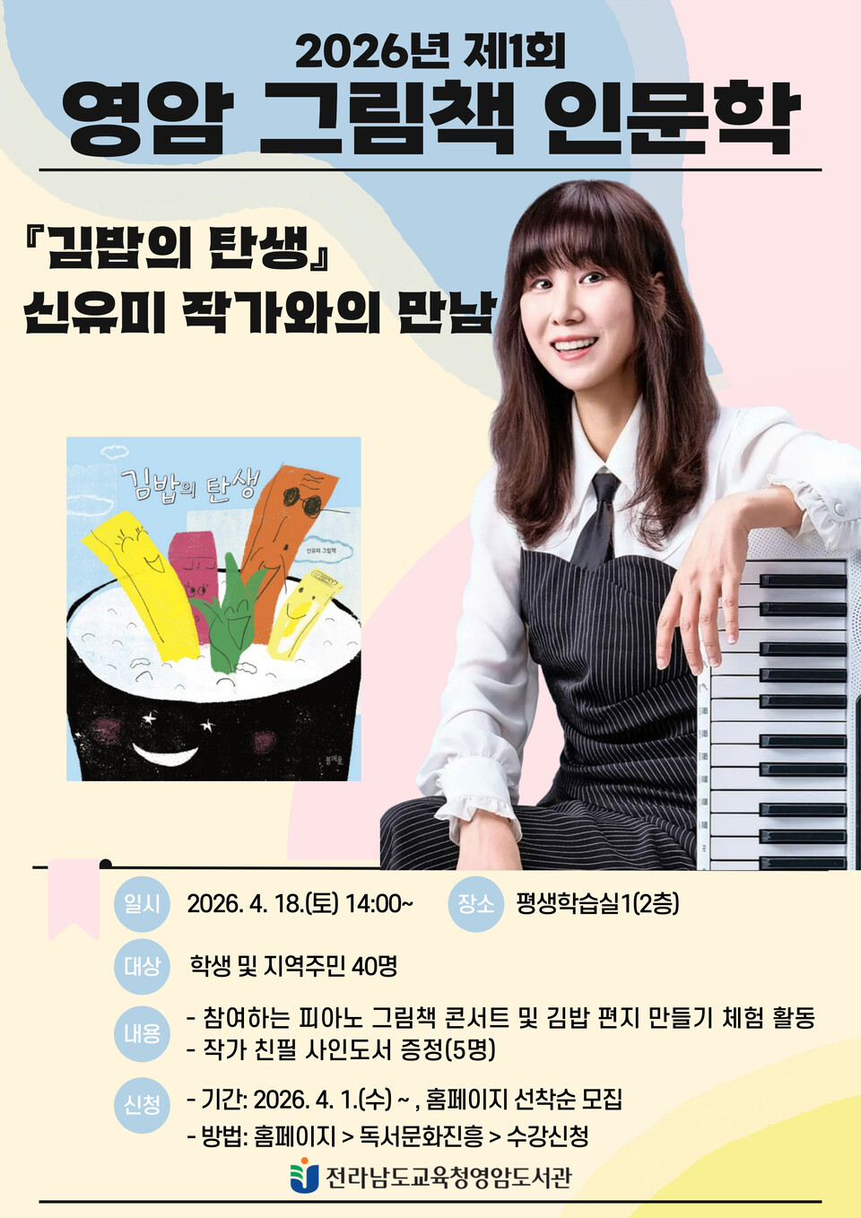 영암공공도서관)은 오는 4월 18일 오후 2시, 2026년 영암 그림책 인문학 강연으로 『김밥의 탄생』 신유미 작가를 초청해 특별한 만남을 갖는다 이번 강연은 『김밥의 탄생』을 주제도서로 작가와 함께 그림책을 낭독하며 이야기를 깊이 있게 이해하는 시간으로 진행될 예정이다.