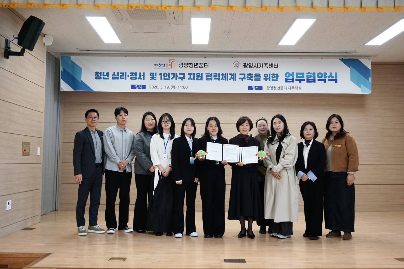 광양청년꿈터(센터장 배혜금)와 광양시가족센터(센터장 이주화)는 지난 3월 19일 광양청년꿈터에서 지역 청년의 심리·정서 지원과 건강한 관계 형성을 위한 업무협약(MOU)을 체결했다고 밝혔다.
