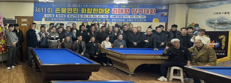 함평군은 2일 “손불면 당구동호회가 주관한 ‘제11회 손불면민 화합한마당 리(리)대항 당구대회’가 손불면 나비당구장에서 성황리에 열렸다”고 밝혔다.