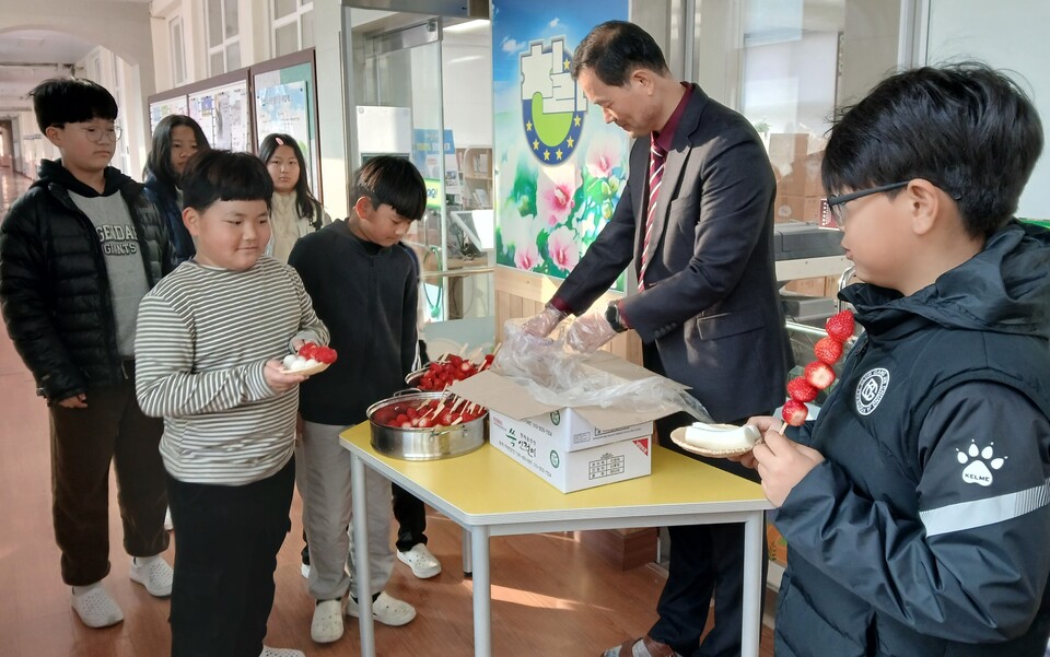 칠량초등학교(교장 전춘식)는 3월 17일, 아침 간식으로 가래떡과 딸기를 나누어 주었다.