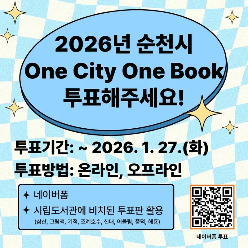 [제목: 2026년 One City One Book 시민 투표 진행] 순천시가 오는 27일까지 2026년 한 해 동안 순천시민이 함께 읽을 ‘2026년 순천시 One City One Book’ 선정을 위하여 시민 투표를 진행한다고 밝혔다. One City One Book 시민 투표는 온라인과 오프라인으로 진행된다.