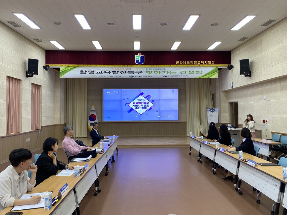 전라남도함평교육지원청(교육장 최은순)은 지난 4월 16일, 함평 교육발전특구의 성공적인 안착과 실무 역량 강화를 위해 교육청·지자체·학교 관계자가 참여한 ‘함평교육발전특구 찾아가는 컨설팅’을 개최했다.