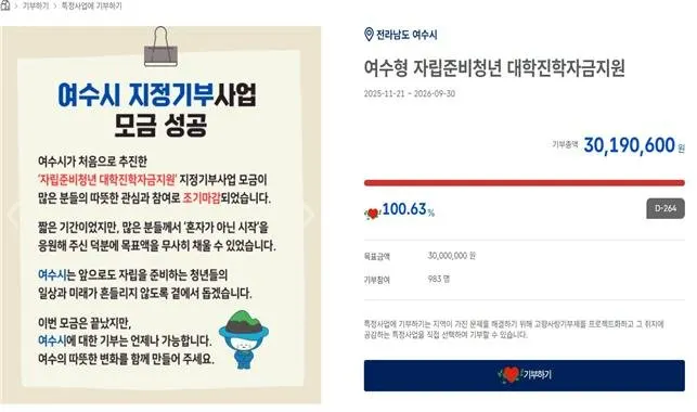 시 관계자는 “여수 고향사랑기부제에 적극 참여해 준 모든 기부자분들께 깊이 감사드린다”라며, “세제 혜택이 더욱 확대되는 만큼, 앞으로도 많은 분들이 여수시와 소중한 인연을 맺고 지역 발전에 동참할 수 있도록 매력적인 답례품과 기부자가 공감하는 기금 사업을 지속적으로 발굴해나가겠다”라고 밝혔다.