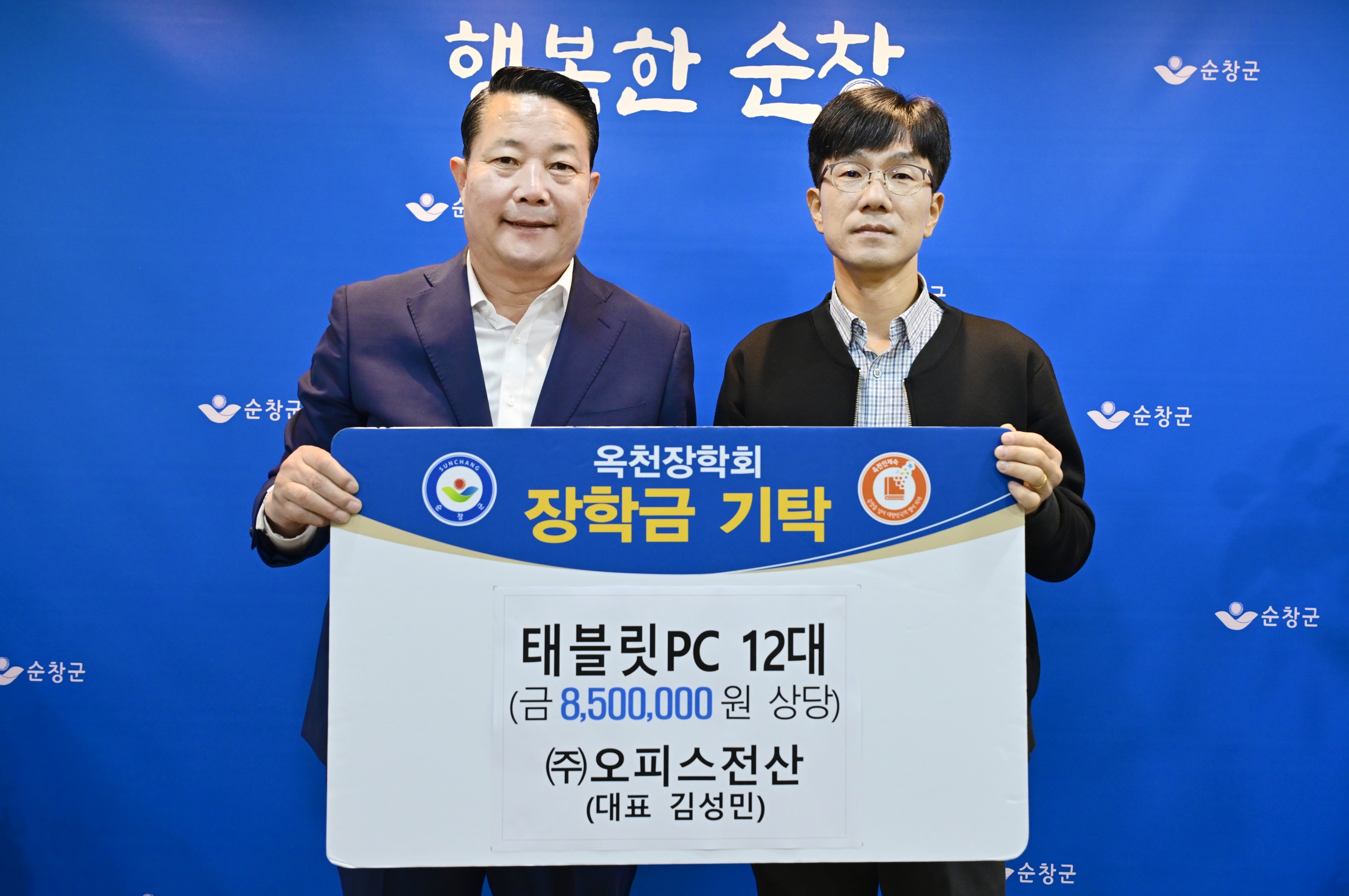 순창군은 7일 ㈜오피스전산(대표 김성민)이 지역 학생들의 학습환경 개선을 위해 순창군옥천장학회(이사장 최영일 순창군수)에 태블릿PC 12대(약 850만 원 상당)를 기탁했다고 밝혔다.