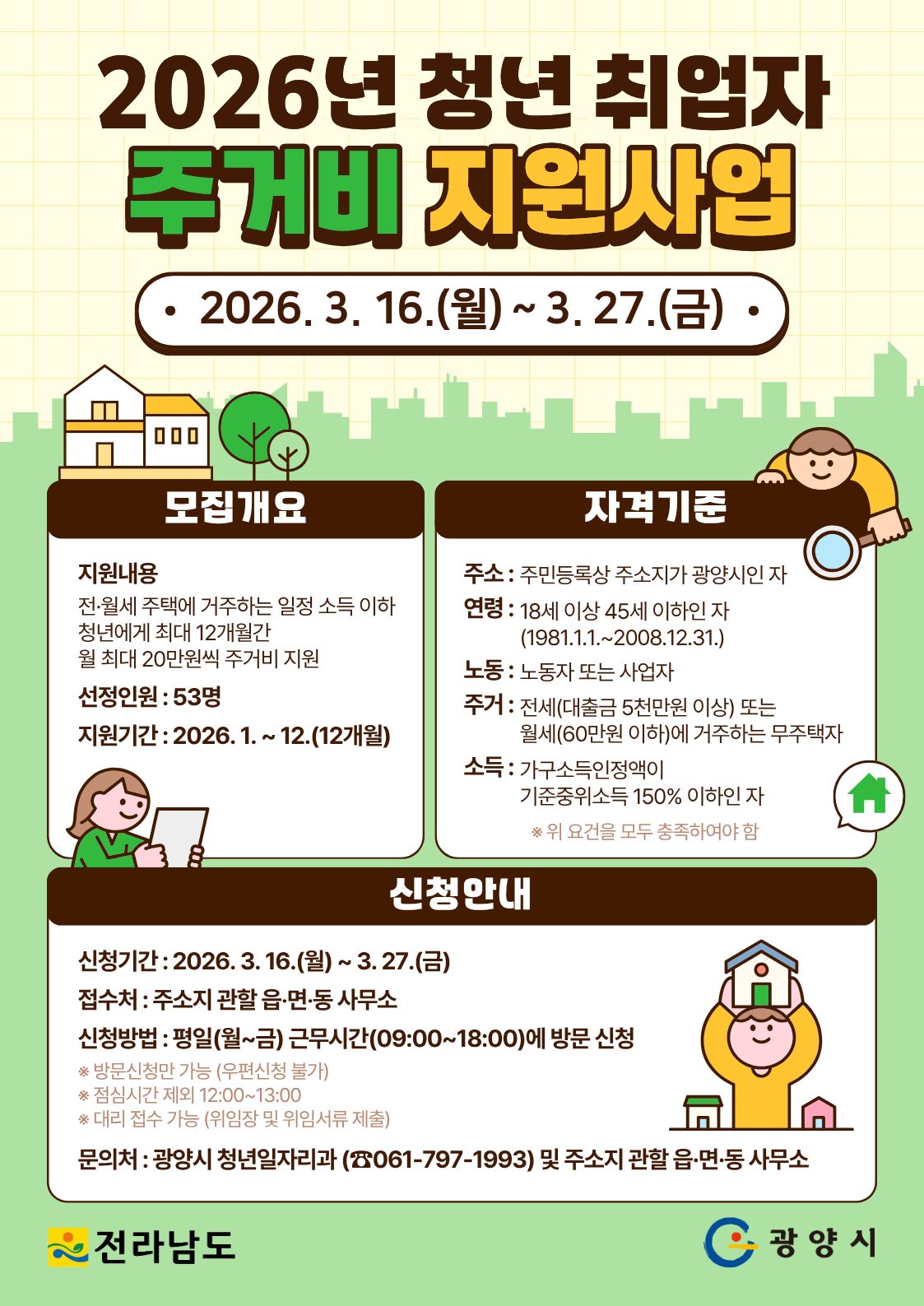 광양시는 지역에서 일하는 청년들의 주거비 부담을 완화하고 안정적인 생활 기반 마련을 위해 2026년 ‘청년 취업자 주거비 지원사업’을 추진하고 참여자를 모집한다고 밝혔다.