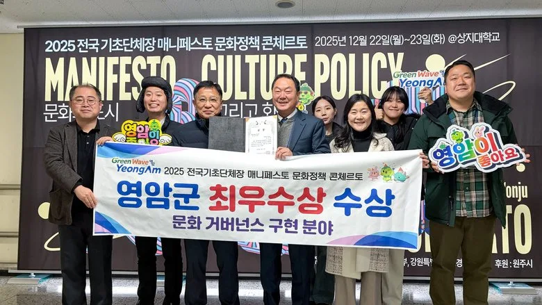 Subtitle: 영암군이 '2025 전국 기초단체장 매니페스토 문화정책 콘체르토'에서 최우수상 수상 영암군(군수 우승희)이 22~23일 강원특별자치도 원주시 상지대학교에서 열린 ‘2025 전국 기초단체장 매니페스토 문화정책 콘체르토’에서 ‘문화거버넌스 구현’ 부문 최우수상을 수상했습니다. 이번 콘체르토에서는 전국 85개 기초자치단체가 제출한 160개 문화정책 사례 가운데 1차 심사를 통과한 86개 사례가 발표되었습니다. 영암군은 ‘사람의 관계가 정책이 되고 모두의 삶이 존중받는 영암 문화 협치 시스템’으로 전국 군 단위 최우수, 전남 유일 수상 지자체로 이름을 올렸습니다. 영암문화관광재단을 중심으로 한 영암군의 문화정책 추진 체계를 소개하며, 행정 주도의 사업 집행을 넘어주민과 예술인, 지역단체를 연결하는 문화협치 플랫폼, 현장의 목소리를 정책으로 환류하는 구조를 재단이 만들어가고 있습니다. 이튿날에는 영암문화관광재단이 문화정책 경진대회 사례발표를 진행했습니다. 재단은 주민 주도 문화 기획과 협치 기반 정책 실행 과정을 사례 중심으로 발표해 심사위원단의 높은 점수를 받았습니다. 우승희 영암군수는 “문화는 선택이 아니라 지방정부의 기본 체력이다. 최우수상 수상은 영암군이 사람과 관계를 중심에 둔 문화협치를 꾸준히 실천해 온 결과로, 앞으로도 군민이 일상에서 체감할 수 있는 문화정책을 이어가겠다"고 밝혔습니다. 영암군은 올해 7월 열린 전국 매니페스토 경진대회에서도 경제 분야 최우수상을 수상하는 등, 문화와 경제 전반에서 정책 경쟁력을 입증해 오고 있습니다.