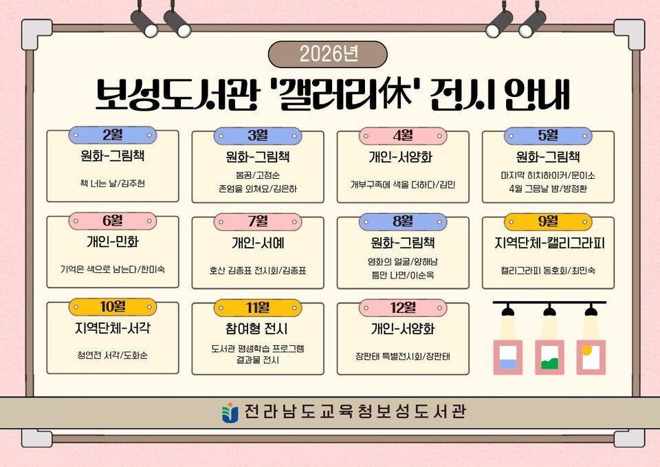 전라남도교육청보성도서관은 2026년 2월부터 12월까지 도서관 1층‘갤러리 休’에서 연중 전시를 운영한다.‘갤러리 休’는 도서관 공간을 활용해 문화 친화적 환경을 조성하고, 지역 예술인과의 협력을 통해 주민의 문화예술 접근성을 높이기 위해 마련된 전시 공간이다.