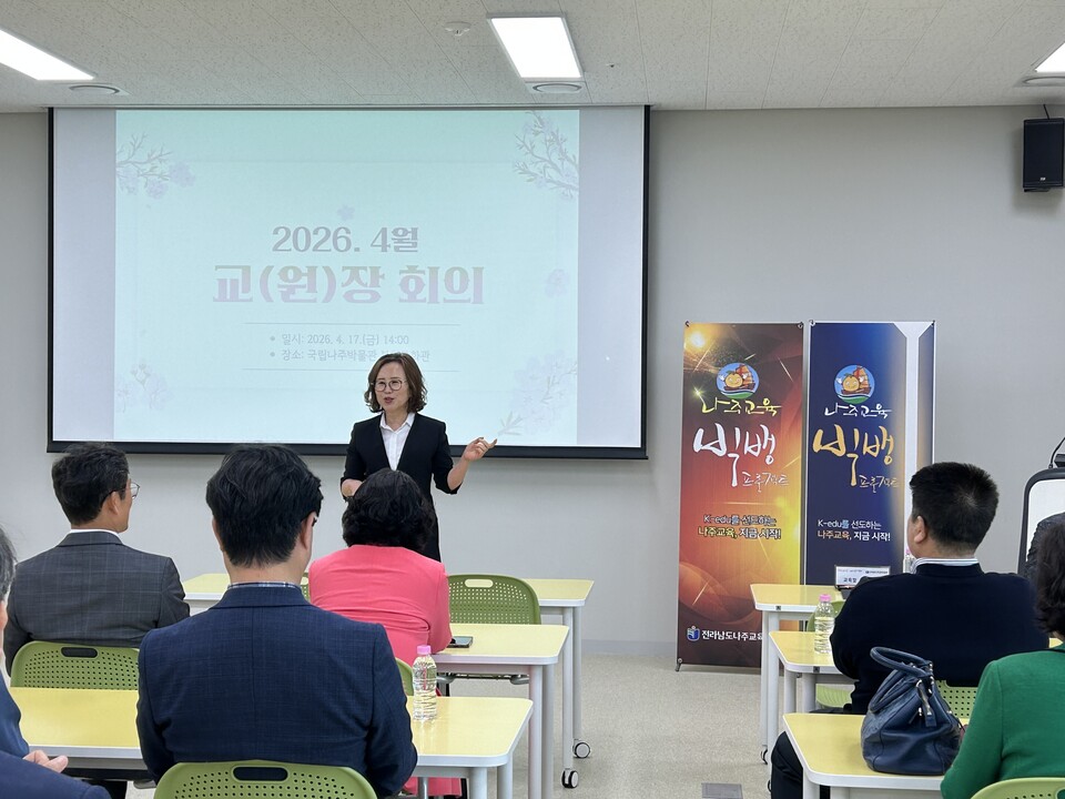 이번 4월 교(원)장회의는 지난 3월 개관한 국립나주박물관 복합문화관에서 개최되었으며, 학교 교육과정과 연계한 박물관 활용 방안을 안내하고 지역 문화·역사 자원을 활용한 「나주 의(義)·온(溫)·예(禮) 교육」 실현을 위한 협력 기반을 마련하는 데 목적을 두었다.