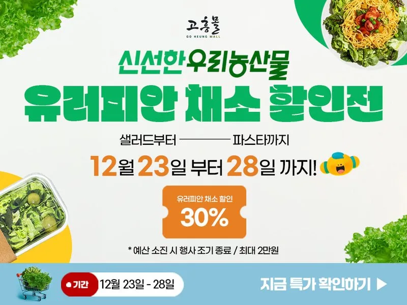 고흥군, 고흥몰에서 오는 28일까지 유러피안 채소 할인전 진행 고흥군, 고흥몰에서 오는 28일까지 유러피안 채소 할인전 진행 고흥군(군수 공영민)이 운영하는 온라인 농수축특산물 쇼핑몰 ‘고흥몰’이 연말을 맞아 12월 23일부터 28일까지 ‘샐러드부터 파스타까지, 유러피안 채소 할인전’을 진행한다.
