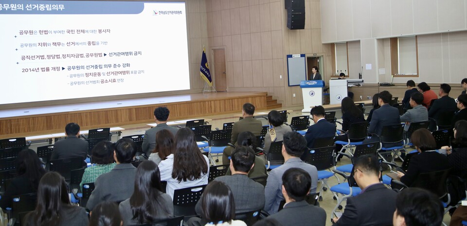이날 ‘공무원의 선거관여행위 금지’를 주제로 강의에 나선 전라남도선거관리위원회 정수현 지도담당관은 공무원의 선거중립 의무와 주요 제한·금지 규정을 안내했다.