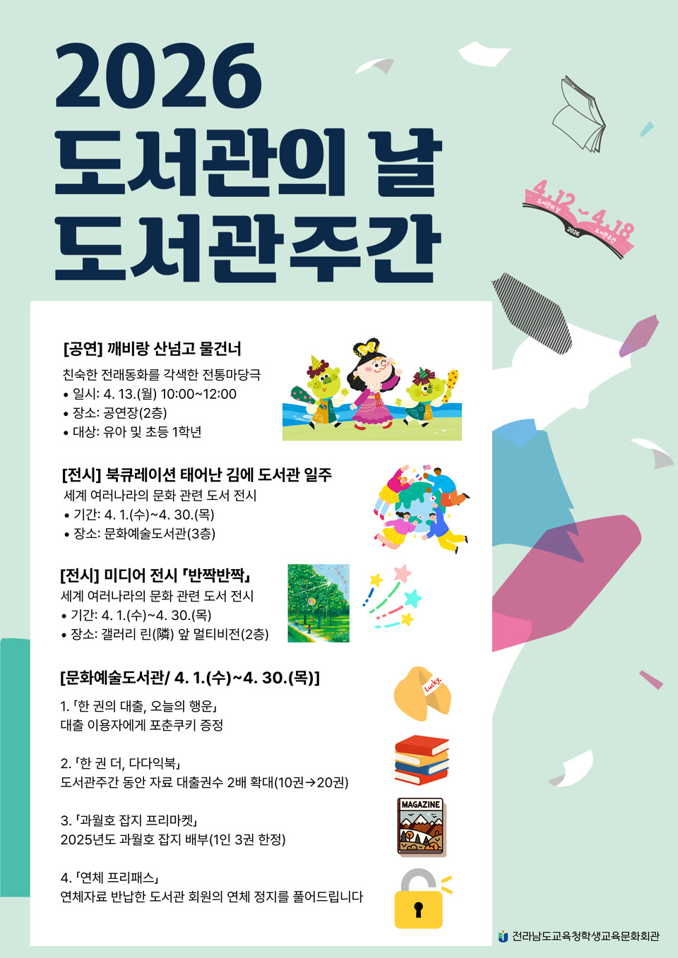 전라남도교육청학생교육문화회관(관장 김광일)은 4월 한달간 2026년 도서관주간 행사를 진행한다. 4월 13일(월)에는 전통 마당극「깨비랑 산넘고 물건너」가 유아 및 초등학교 1학년을 대상으로 2회 진행된다.