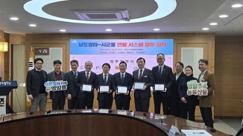 영암군이 지난달 28일 전남도청에서 전라남도, 남도장터, 고흥·완도군과 ‘남도장터–시·군몰 연합시스템 구축 업무협약’을 체결했다.