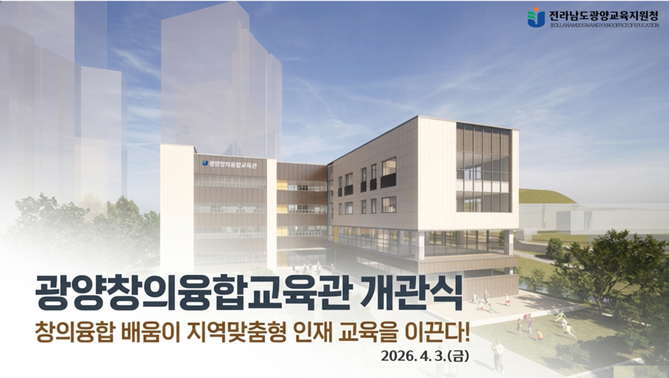 전라남도광양교육지원청(교육장 김여선)은 4월 3일(금) 광양시 성황동에 위치한 광양창의융합교육관에서 교육감, 교육장, 지역 인사, 학부모 및 학생 등 100여 명이 참석한 가운데 개관식을 개최하고, ‘광양의 배움, K-교육을 이끈다’는 교육 비전 실현의 본격적인 출발을 알렸다.