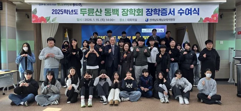 전라남도해남교육지원청(교육장 조연주)은 1월 15일(목) 오후 2시, 2025학년도 두륜산 동백장학회 장학증서 수여식을 개최하고 지역 학생 39명에게 장학증서를 전달하였다.