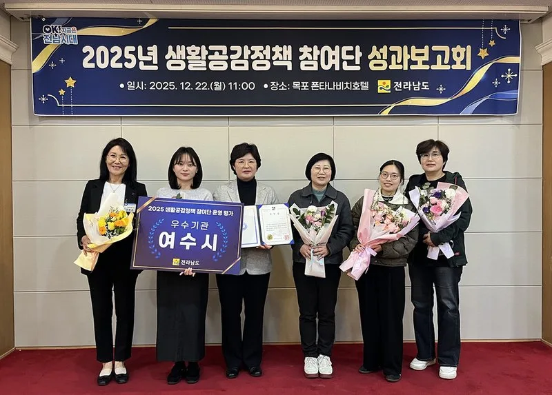전남 여수시, 2025년 생활공감 정책 참여단 평가 최종 순위 1위 전남도에서 발표한 2025년 생활공감 정책 참여단의 최종 순위 결과에 따르면, 전남 여수시는 전남도 21개 시군 가운데 1위를 차지했다. 평가는 3월부터 10월까지의 활동을 평가하였고, 여수시가 정기 나눔·봉사활동과 홍보실적 등에서 높은 평가를 받았다. 앞으로 여수시는 참여단의 정책 모니터링 및 시정 발전에 도움이 되는 활동에 지원할 것이다.