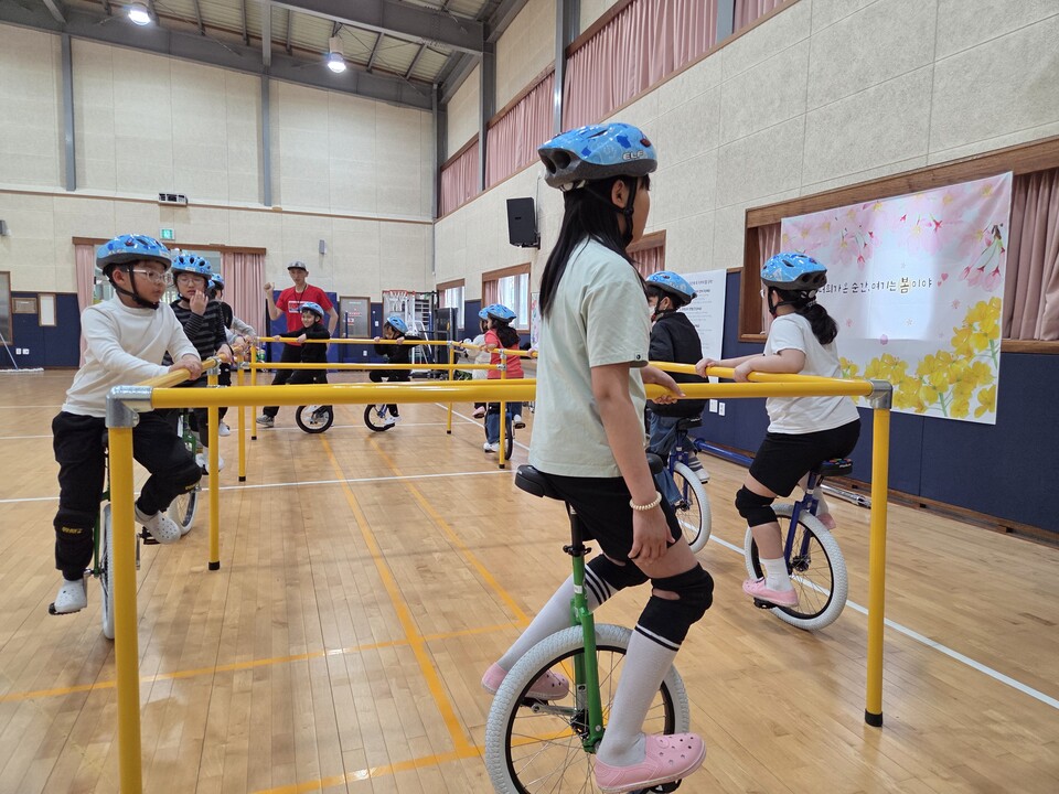외발자전거 방과후 교육과정은 학생들의 신체 균형감각과 정서 발달, 협동심 증진에 크게 기여하고 있다.