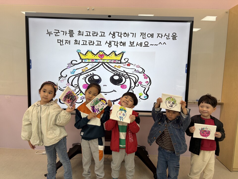 아이들은 다른 사람을 부러워하기보다 각자가 가진 고유한 장점을 발견하고, ‘내가 세상에서 최고’라는 마음을 담아 자신의 얼굴을 정성껏 꾸미는 미술 활동에 참여했다.