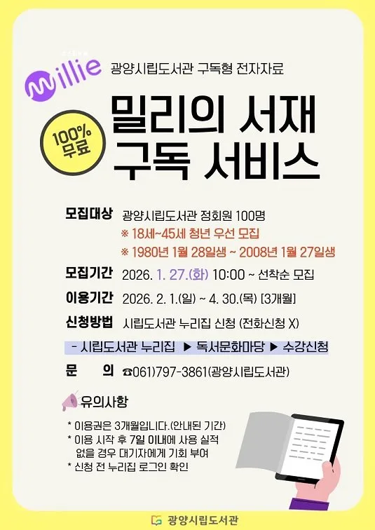 광양중앙도서관이 청년층의 독서 습관 형성과 온라인 독서문화 확산을 위해 전자책 구독 서비스 ‘밀리의 서재’ 참여자를 모집한다.