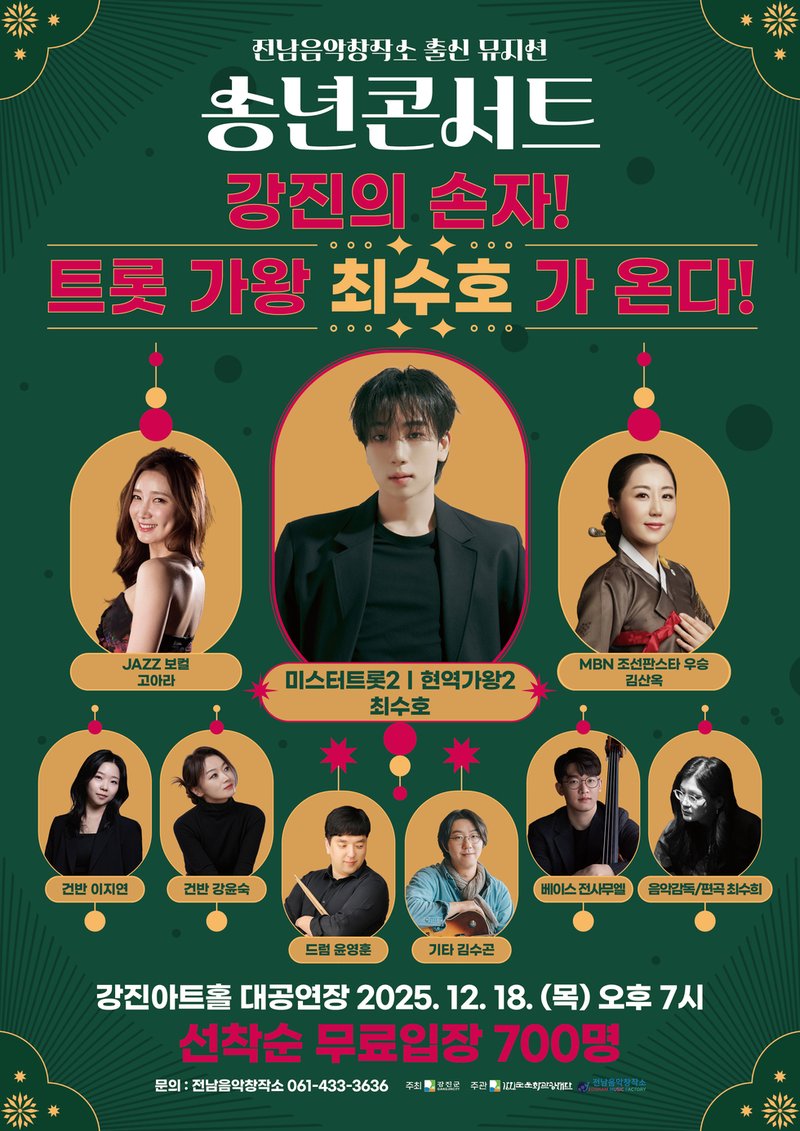 (재)강진군문화관광재단 전남음악창작소가 12월 18일 강진아트홀 대공연장에서 '2025 전남음악창작소 뮤지션 송년콘서트'를 개최한다. 이번 공연은 전남음악창작소가 발굴하고 지원한 지역 뮤지션들의 무대와 함께 가수 최수호가 참여하여 전통과 현대를 잇는 무대를 선보일 예정이다.