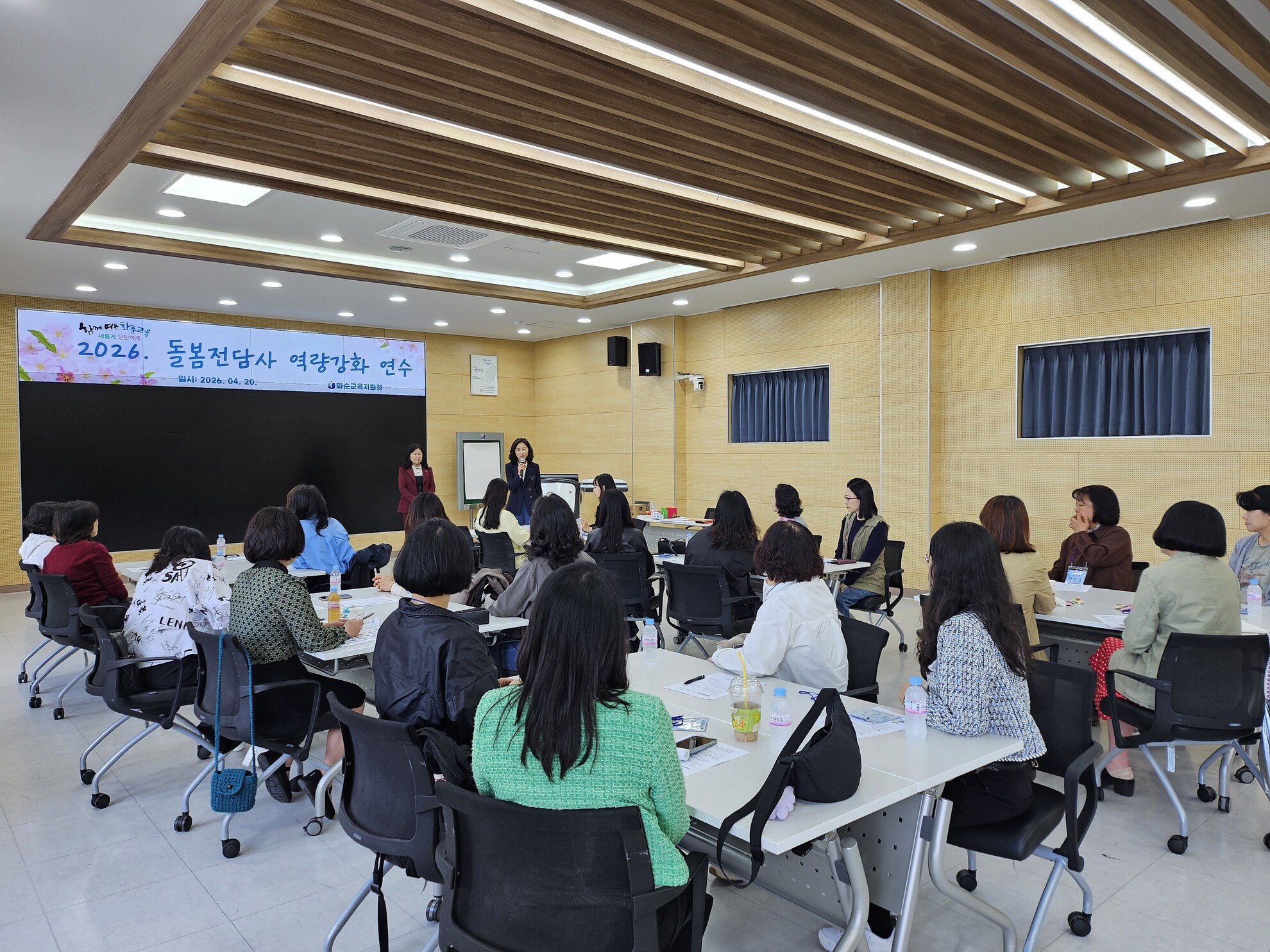 화순교육지원청(교육장 이지현)은 4월 20일(월) 학교종합지원센터 주관으로 화순 관내 돌봄전담사 23명을 대상으로 역량강화 연수를 개최하여 돌봄교실 운영의 내실화를 도모하고 성인지 감수성과 청렴 의식을 강화하기 위하여 마련되었다.