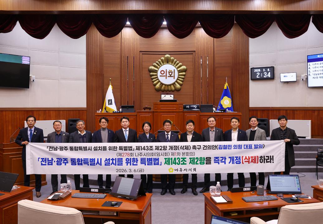 건의안을 대표 발의한 김철민 의원은 "광주·전남 공동혁신도시는 국가균형발전 정책의 핵심 거점이자 대한민국 에너지 산업을 이끄는 중요한 기반"이라며 "통합특별시 출범 이후 추가 혁신도시 지정 가능성이 열릴 경우 기존 혁신도시의 기능과 위상이 약화될 수 있는 만큼 해당 조항에 대한 신중한 재검토가 필요하다"고 강조했다.