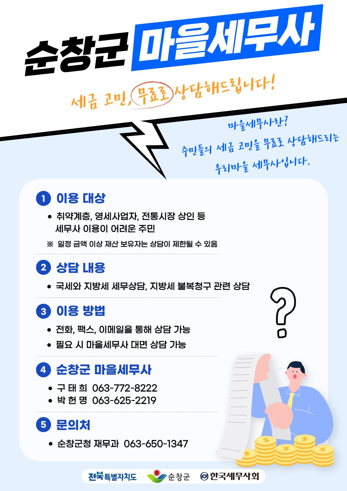 현재 순창군에는 2명의 마을세무사가 활동 중이며, 세무상담을 희망하는 군민은 남원 소재 세무사(063-772-8222, 063-625-2219) 전화 또는 서면상담을 신청하면 된다.