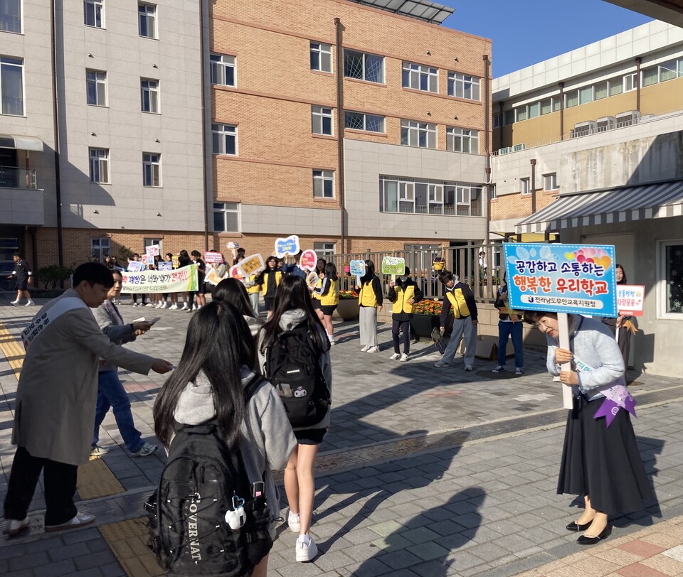 이날 캠페인에서는 무안행복중 학생회가 중심이 되어 등교 시간 교문 앞에서 학교폭력 근절 메시지를 전달하고, 피켓과 어깨띠를 활용해 다양한 예방 구호를 알렸다.