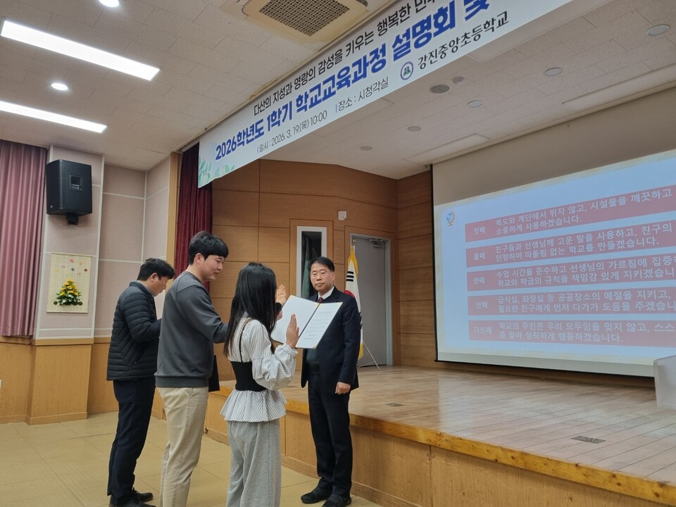 전라남도 강진중앙초등학교는 학생·학부모·교사가 함께 참여해 ‘학교문화 책임규약’을 제정하고 3월 19일 (목) 학교교육과정 설명회에서 공동 선서를 진행해 실천 중심의 학교문화 조성에 나섰다.