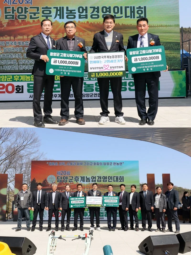(사)한국후계농업경영인 담양군연합회(회장 서정범)가 지난 21일 열린 ‘제20회 담양군 후계농업경영인대회’에서 고흥군연합회(회장 이재철), 함양군연합회(회장 염봉섭)와 고향사랑기부금 상호 기탁식을 진행했다.