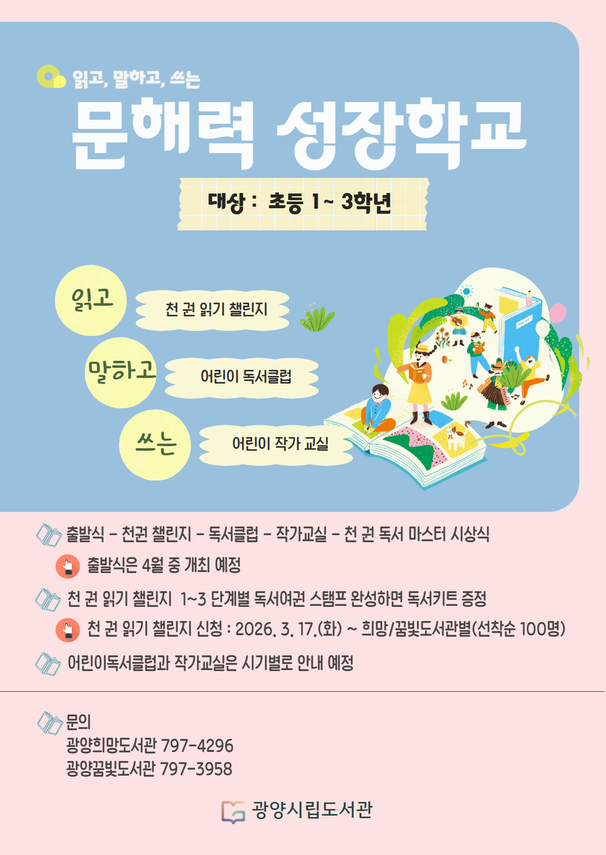 한편, 문해력 성장학교 「천 권 읽기 챌린지」는 3월 17일부터 광양시립도서관 누리집에서 광양희망도서관과 광양꿈빛도서관 각각 선착순 100명을 모집한다.