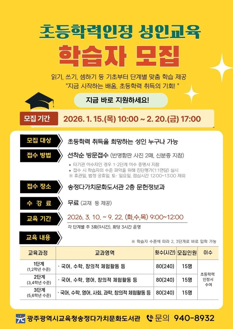 교육은 초등학력 취득을 희망하는 성인이면 누구나 참여 가능하며 단계별 15명씩 총 45명을 선착순으로 모집한다.