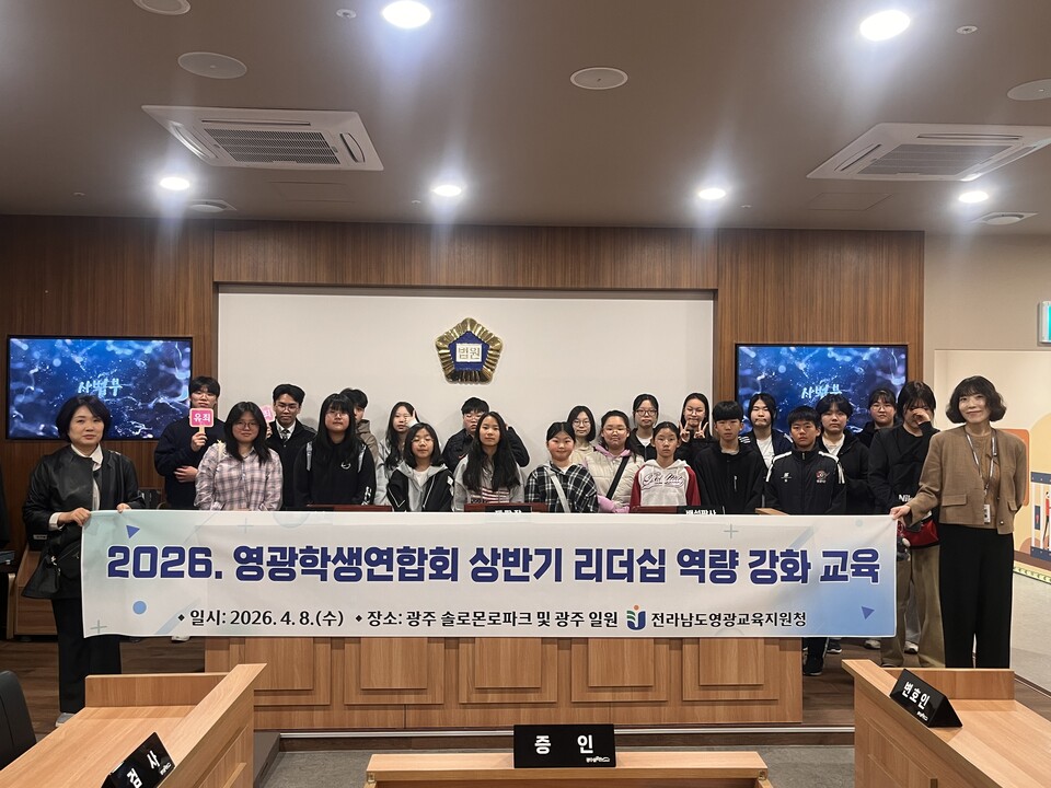 전라남도영광교육지원청(정병국 교육장)은 4월 8일 광주 일원에서 영광 초·중·고 학생 대표및 교육지원청 관계자 27명이 참여한 가운데 ‘2026 영광학생연합회 상반기 리더십 역량 강화 교육’을 운영해 학생자치 역량을 높이는 계기를 마련했다.