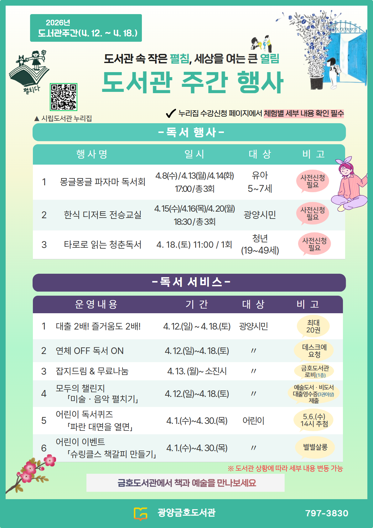 광양금호도서관이 4월 도서관주간을 맞아 시민이 책과 예술을 함께 즐길 수 있도록 다양한 특별 프로그램을 운영한다.