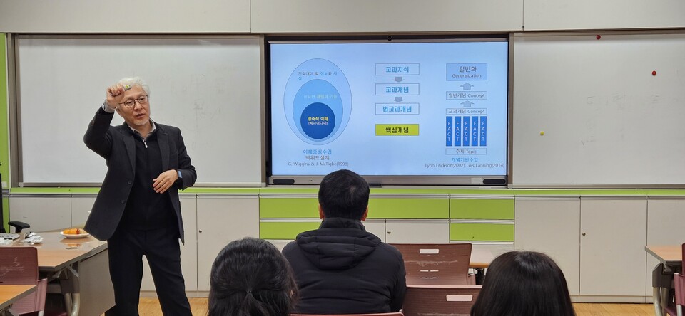 연수에서는 임영구 전 표선고등학교 교장을 강사로 초청하여 “미래교육으로서 IB교육의 이해”를 주제로 강연이 이루어졌으며, 제주도 IB 학교 운영 경험을 바탕으로 IB 교육의 철학과 특징, 학교 현장 적용 사례 등을 생생하게 전달했다.