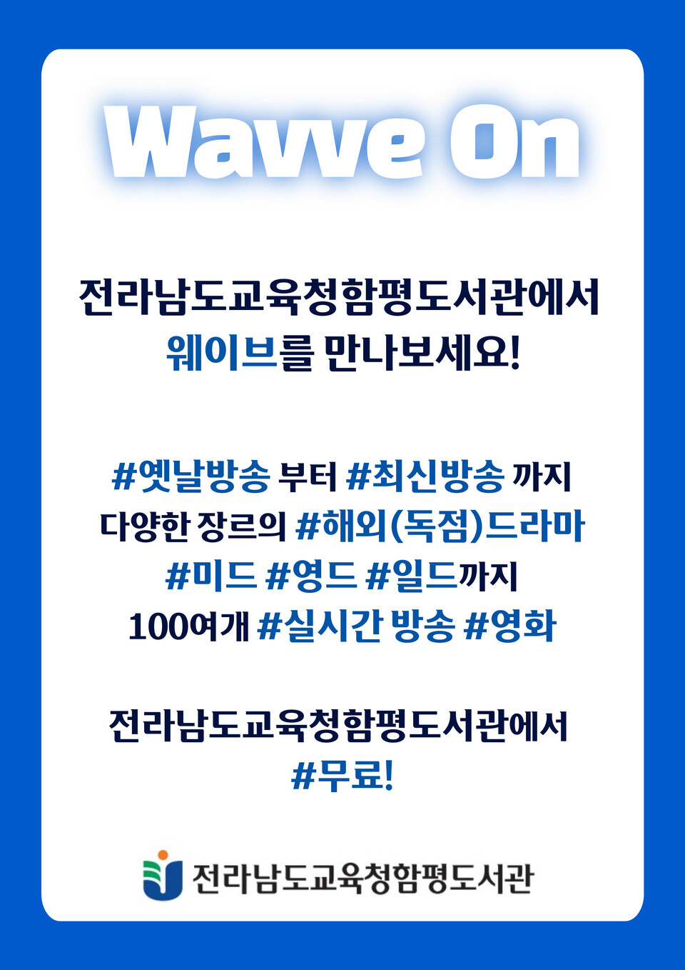 전라남도교육청함평도서관(관장 박향미)은 3월부터 12월까지 디지털자료실에서 ‘웨이브온(Wavve on) VOD 스트리밍 서비스’를 운영해 국내·외 영화와 방송 콘텐츠를 실시간으로 제공한다.