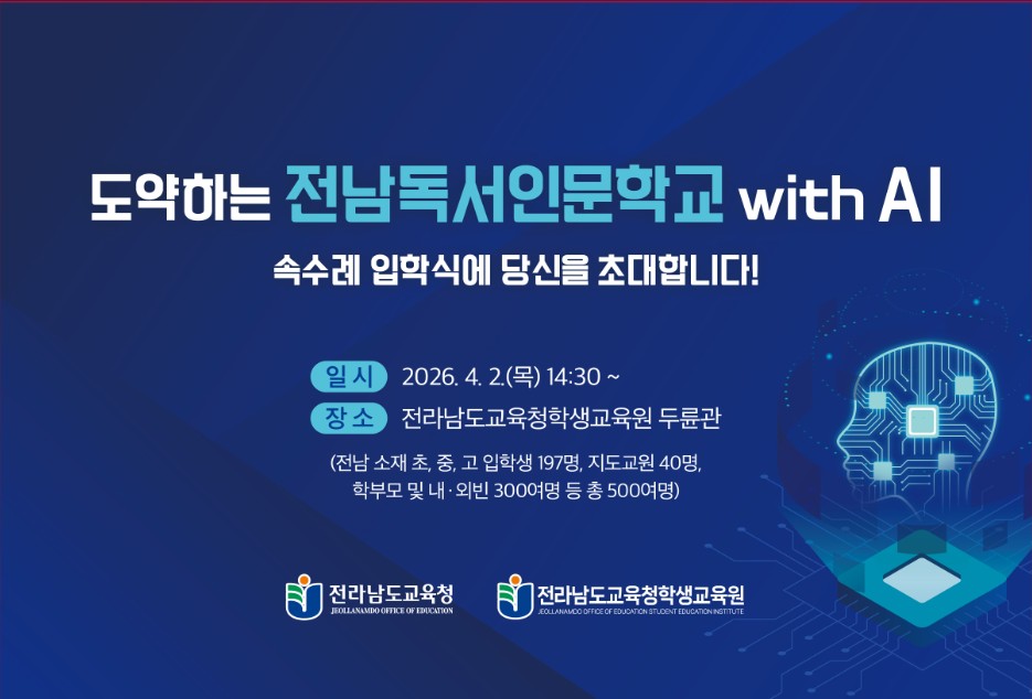 전라남도교육청학생교육원(원장 김창근)은 오는 4월 2일 초·중·고 신입생과 학부모, 내빈 등이 참석한 가운데 ‘2026.