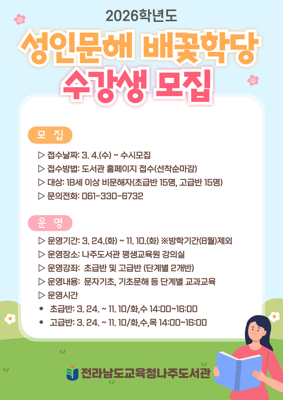전라남도교육청나주도서관(관장 김의곤)은 오는 3월 24일부터 성인 학습자의 기초 문해 역량을 강화해 삶의 질을 높이고 지역사회 참여를 확대하기 위해 성인문해 배꽃학당을 운영한다.