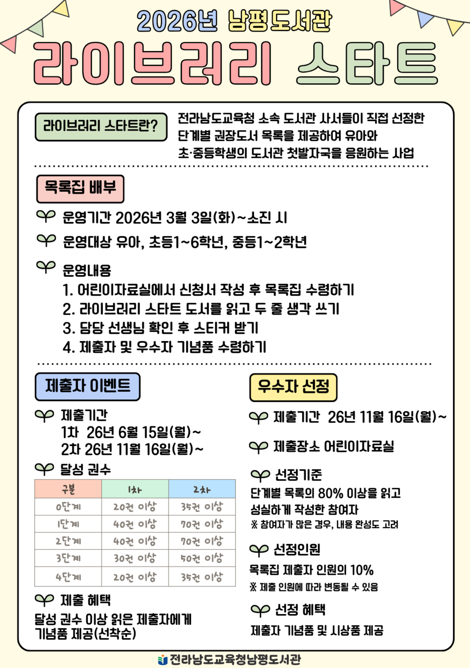 전라남도교육청남평도서관(관장 유미라)은 새 학년 새 학기를 맞이하는 학생들의 독서습관 형성과 도서관 이용 활성화를 위해 단계별 라이브러리 스타트(Library Start) 과정을 3월 3일(화)부터 운영한다.