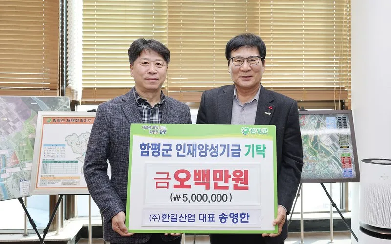 전남 함평군은 “지난 13일, ㈜한길산업 송영한 대표가 인재양성기금으로 5백만 원을 기탁했다”고 14일 밝혔다. ㈜한길산업은 함평 학교농공단지에 소재한 업체로, 지난해 고향사랑기부금 기탁에 이어 올해는 함평군 미래 인재 양성을 위한 인재양성기금을 전달하며 지역 발전을 위한 나눔을 적극적으로 실천하고 있다.