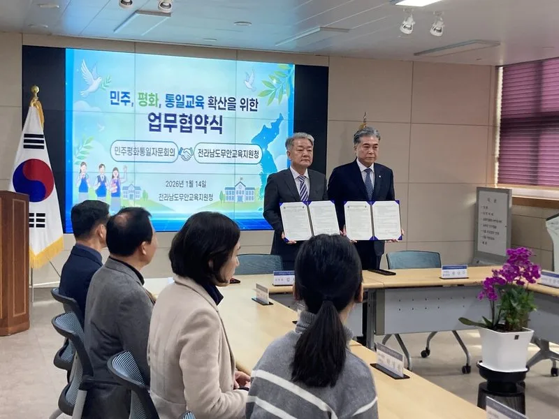 전라남도 무안교육지원청은 2026년 1월 14일(수) 민주평화통일자문회의 무안군협의회와 3층 대회의실에서 ‘민주·평화·통일교육 확산을 위한 업무협약(MOU)을 체결하였다.